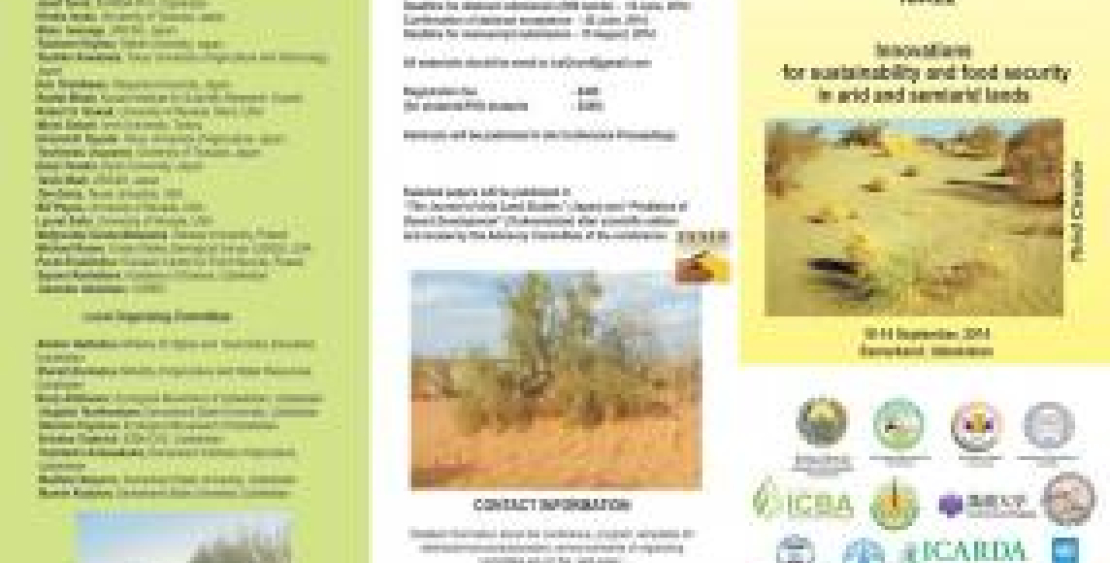 The 2nd International Conference on Arid Land Studies (ICAL2) will be held September 10-12, 2014 in Samarkand, Uzbekistan. This conference builds on the outcomes from International Forum on Desert Technology X and First International Conference on Arid Land Studies (ICAL1), sponsored by the Japanese Association for Arid Land Studies (JAALS).
