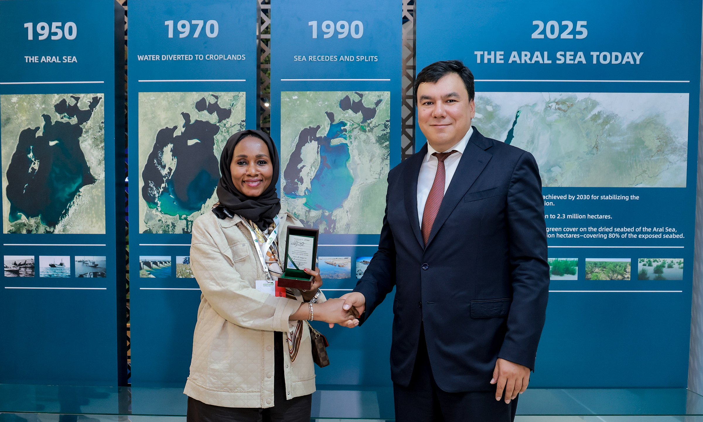 The badge was formally presented by His Excellency Aziz Abdukhakimov, Minister of Ecology, Environmental Protection and Climate Change of the Republic of Uzbekistan, during a ceremonial event held at Eco Expo Central Asia 2025 in Tashkent.
