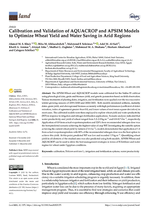 The APSIM-Wheat and AQUACROP models were calibrated for the Sakha 95 cultivar using phenological data, grain and biomass yield, and genetic parameters based on field observation. Various treatments of planting dates, irrigation, and fertilization were applied over the two successive winter growing seasons of 2019/2020 and 2020/2021. Both models simulated anthesis, maturity dates, grain yield, and aboveground biomass accurately with high performances (coefficient of determination, index of agreement greater than 0.8, and lower values of root mean square deviation) in most cases. The calibrated models were then employed to explore wheat yield and water productivity (WP) in response to irrigation and nitrogen fertilization applications. Scenario analyses indicated that water productivity and yield of wheat ranged from 1.2–2.0 kg m–3 and 6.8–8.7 t ha–1, respectively. Application of 0.8 from actual evapotranspiration and 120% from recommended nitrogen dose was the best-predicted scenario achieving the highest value of crop WP. Investigating the suitable option achieving the current wheat yield by farmers (7.4 t ha–1), models demonstrated that application of 1.4 from actual evapotranspiration with 80% of the recommended nitrogen dose was the best option to achieve this yield. At this point, predicted WP was low and recorded 1.5 kg m–3. Quantifying wheat yield in all districts of the studied area was also predicted using both models. APSIM-Wheat and AQUACROP can be used to drive the best management strategies in terms of N fertilizer and water regime for wheat under Egyptian conditions.