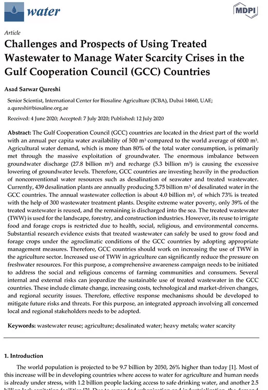 The Gulf Cooperation Council (GCC) countries are located in the driest part of the world with an annual per capita water availability of 500 m3 compared to the world average of 6000 m3. Agricultural water demand, which is more than 80% of the total water consumption, is primarily met through the massive exploitation of groundwater. The enormous imbalance between groundwater discharge (27.8 billion m3) and recharge (5.3 billion m3) is causing the excessive lowering of groundwater levels. Therefore, GCC countries are investing heavily in the production of nonconventional water resources such as desalination of seawater and treated wastewater. Currently, 439 desalination plants are annually producing 5.75 billion m3 of desalinated water in the GCC countries. The annual wastewater collection is about 4.0 billion m3, of which 73% is treated with the help of 300 wastewater treatment plants. Despite extreme water poverty, only 39% of the treated wastewater is reused, and the remaining is discharged into the sea. The treated wastewater (TWW) is used for the landscape, forestry, and construction industries. However, its reuse to irrigate food and forage crops is restricted due to health, social, religious, and environmental concerns. Substantial research evidence exists that treated wastewater can safely be used to grow food and forage crops under the agroclimatic conditions of the GCC countries by adopting appropriate management measures. Therefore, GCC countries should work on increasing the use of TWW in the agriculture sector. Increased use of TWW in agriculture can significantly reduce the pressure on freshwater resources. For this purpose, a comprehensive awareness campaign needs to be initiated to address the social and religious concerns of farming communities and consumers. Several internal and external risks can jeopardize the sustainable use of treated wastewater in the GCC countries. These include climate change, increasing costs, technological and market-driven changes, and regional security issues. Therefore, effective response mechanisms should be developed to mitigate future risks and threats. For this purpose, an integrated approach involving all concerned local and regional stakeholders needs to be adopted.