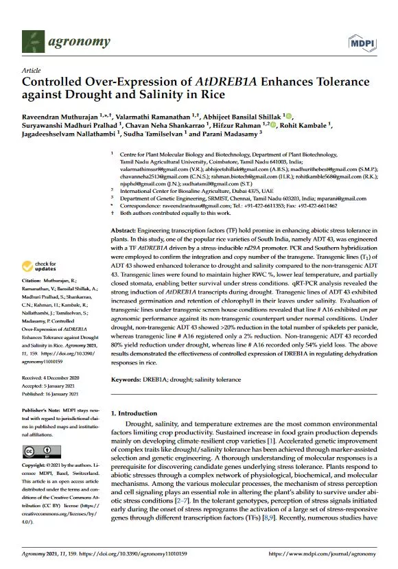 Engineering transcription factors (TF) hold promise in enhancing abiotic stress tolerance in plants. In this study, one of the popular rice varieties of South India, namely ADT 43, was engineered with a TF AtDREB1A driven by a stress-inducible rd29A promoter. PCR and Southern hybridization were employed to confirm the integration and copy number of the transgene. Transgenic lines (T1) of ADT 43 showed enhanced tolerance to drought and salinity compared to the non-transgenic ADT 43. Transgenic lines were found to maintain higher RWC %, lower leaf temperature, and partially closed stomata, enabling better survival under stress conditions. qRT-PCR analysis revealed the strong induction of AtDREB1A transcripts during drought. Transgenic lines of ADT 43 exhibited increased germination and retention of chlorophyll in their leaves under salinity. Evaluation of transgenic lines under transgenic screen house conditions revealed that line # A16 exhibited on par agronomic performance against its non-transgenic counterpart under normal conditions. Under drought, non-transgenic ADT 43 showed >20% reduction in the total number of spikelets per panicle, whereas transgenic line # A16 registered only a 2% reduction. Non-transgenic ADT 43 recorded 80% yield reduction under drought, whereas line # A16 recorded only 54% yield loss. The above results demonstrated the effectiveness of controlled expression of DREB1A in regulating dehydration responses in rice.