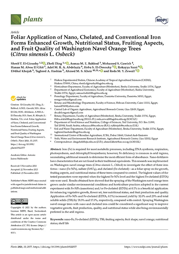 Foliar Application of Nano, Chelated, and Conventional Iron Forms Enhanced Growth, Nutritional Status, Fruiting Aspects, and Fruit Quality ofWashington Navel Orange Trees (Citrus sinensis L. Osbeck)