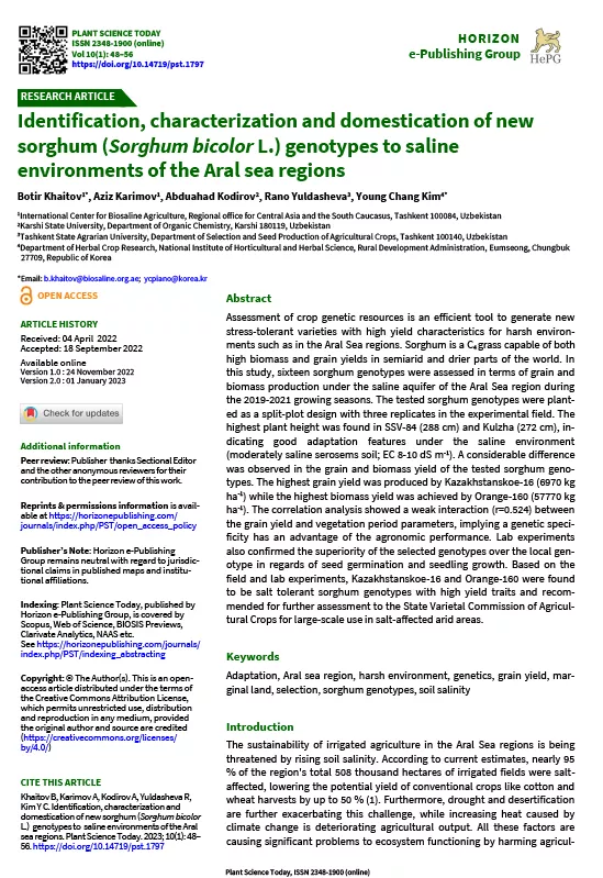 Identification, characterization and domestication of new sorghum (Sorghum bicolor L.) genotypes to saline environments of the Aral sea regions