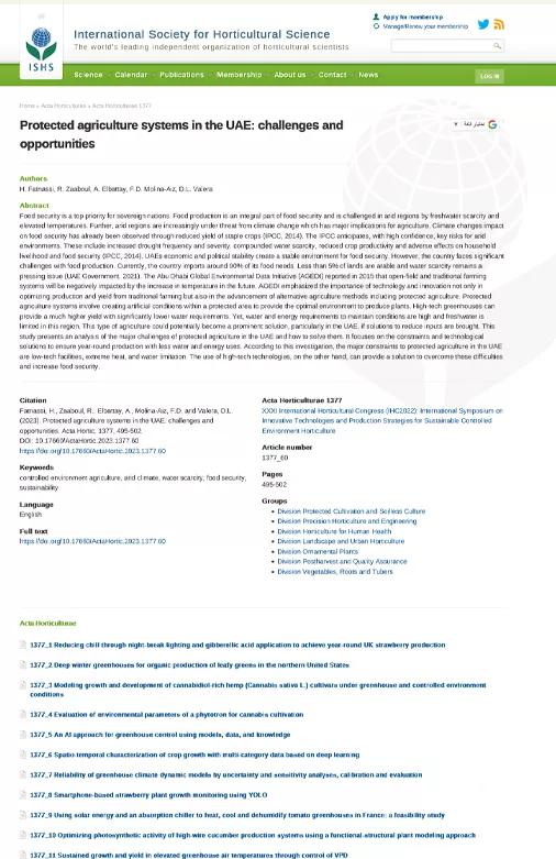 Food security is a top priority for sovereign nations. Food production is an integral part of food security and is challenged in arid regions by freshwater scarcity and elevated temperatures. Further, arid regions are increasingly under threat from climate change which has major implications for agriculture. Climate change’s impact on food security has already been observed through reduced yield of staple crops (IPCC, 2014). The IPCC anticipates, with high confidence, key risks for arid environments. These include increased drought frequency and severity, compounded water scarcity, reduced crop productivity and adverse effects on household livelihood and food security (IPCC, 2014). UAE’s economic and political stability create a stable environment for food security. However, the country faces significant challenges with food production. Currently, the country imports around 90% of its food needs. Less than 5% of lands are arable and water scarcity remains a pressing issue (UAE Government, 2021). The Abu Dhabi Global Environmental Data Initiative (AGEDI) reported in 2015 that open-field and traditional farming systems will be negatively impacted by the increase in temperature in the future. AGEDI emphasized the importance of technology and innovation not only in optimizing production and yield from traditional farming but also in the advancement of alternative agriculture methods including protected agriculture. Protected agriculture systems involve creating artificial conditions within a protected area to provide the optimal environment to produce plants. High-tech greenhouses can provide a much higher yield with significantly lower water requirements. Yet, water and energy requirements to maintain conditions are high and freshwater is limited in this region. This type of agriculture could potentially become a prominent solution, particularly in the UAE, if solutions to reduce inputs are brought. This study presents an analysis of the major challenges of protected agriculture in the UAE and how to solve them. It focuses on the constraints and technological solutions to ensure year-round production with less water and energy uses. According to this investigation, the major constraints to protected agriculture in the UAE are low-tech facilities, extreme heat, and water limitation. The use of high-tech technologies, on the other hand, can provide a solution to overcome these difficulties and increase food security.